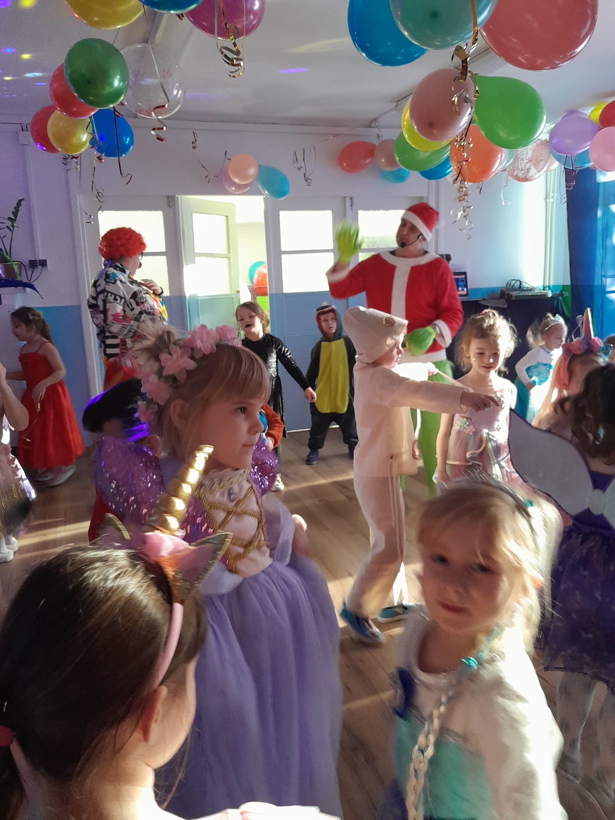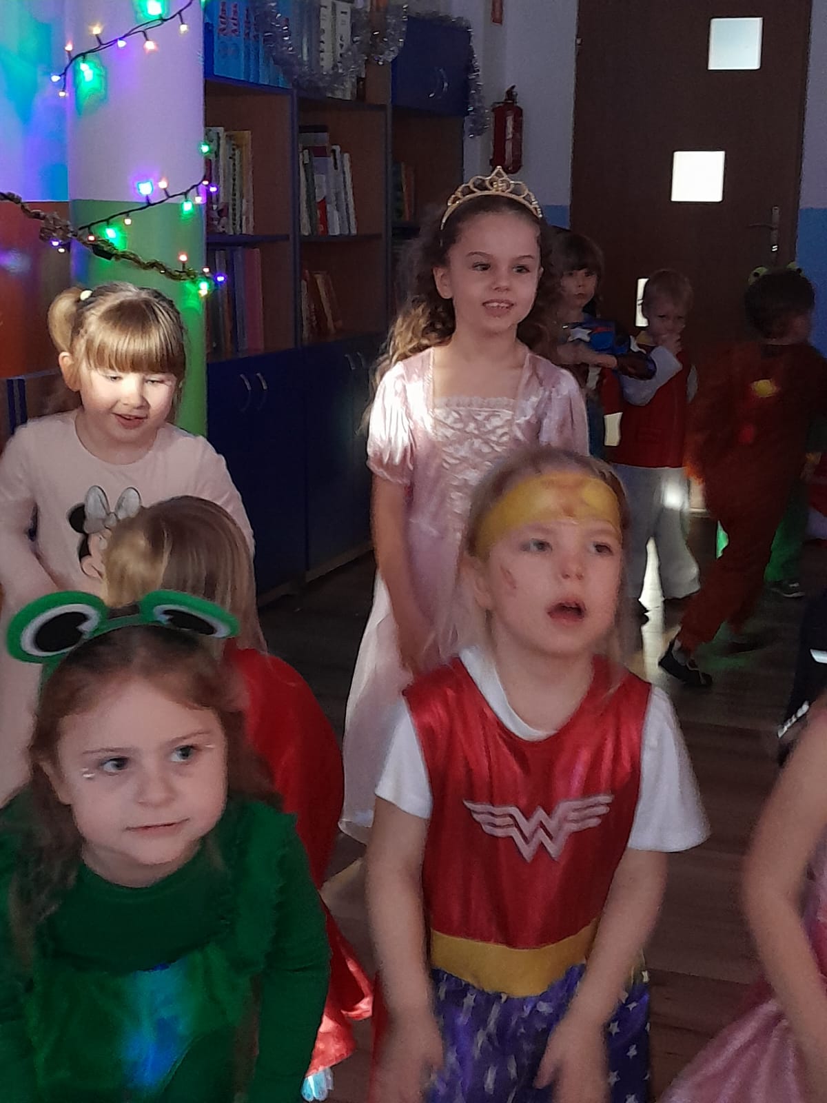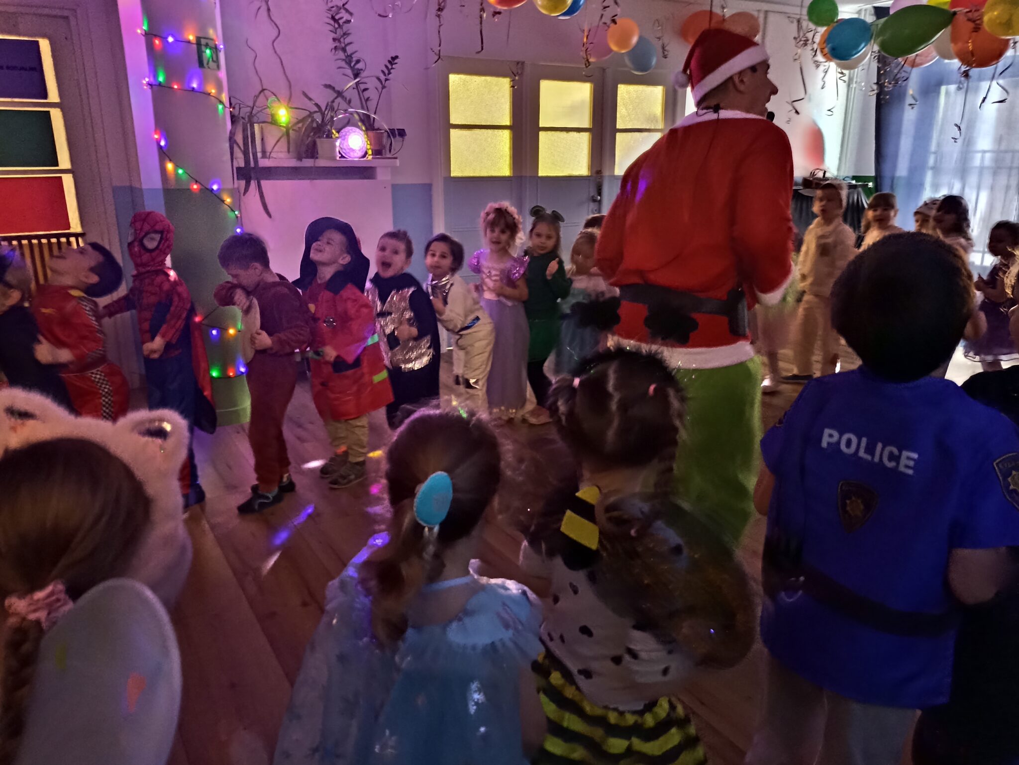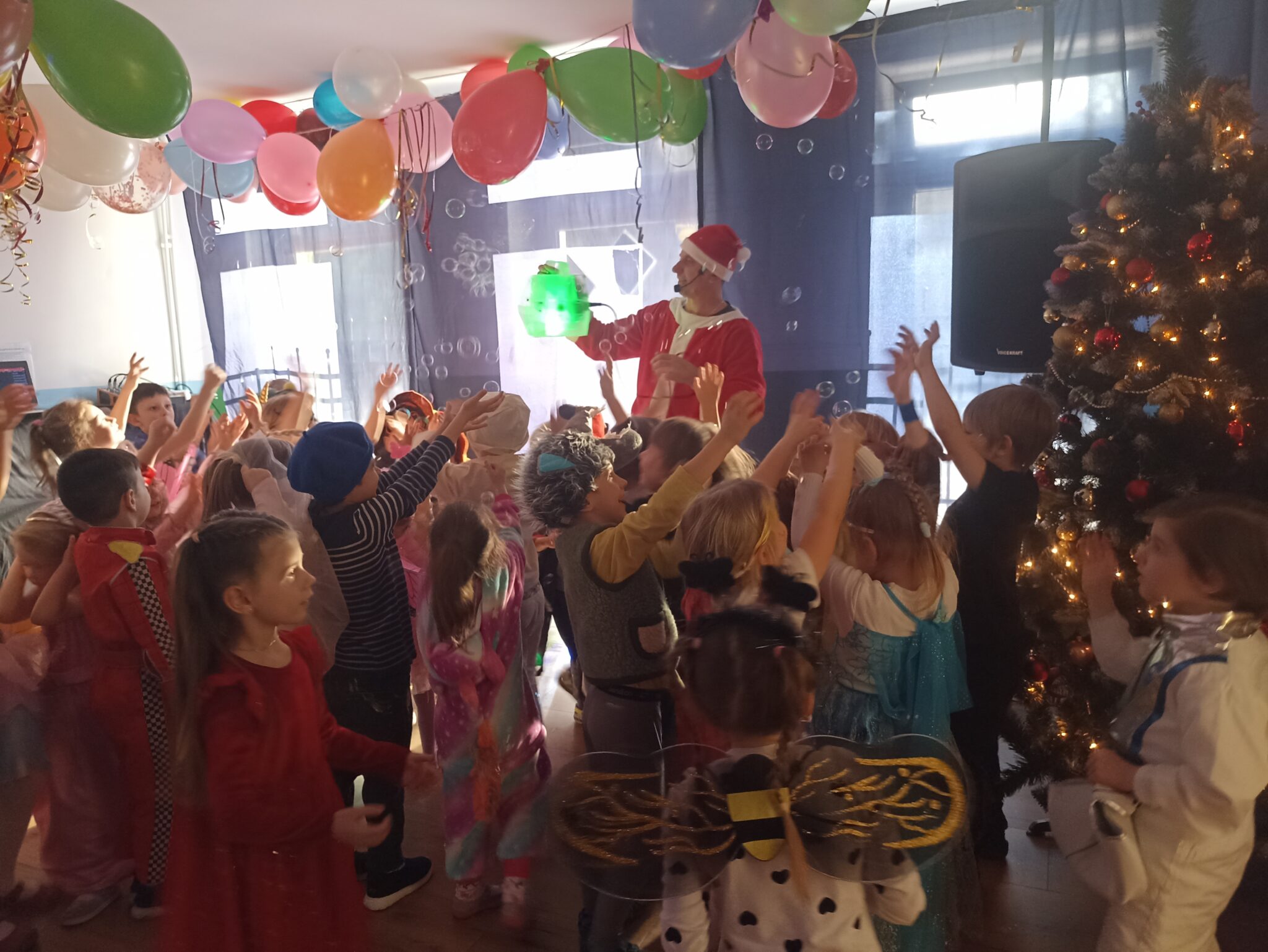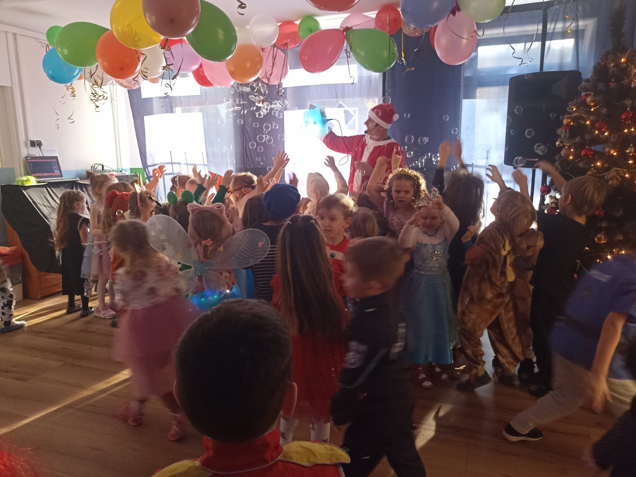 Z wielką radością brały one udział w tańcach i zabawach ruchowych. Nie zabrakło znanych i lubianych utworów, takich jak „Kaczuszki”, „Chocolate”, „Gummy Bear” oraz wesołych tańców-wygibańców. Śmiechu i uśmiechów było co niemiara. Bal był bardzo udany i na długo pozostanie w pamięci najmłodszych. 🎭🎶🫧