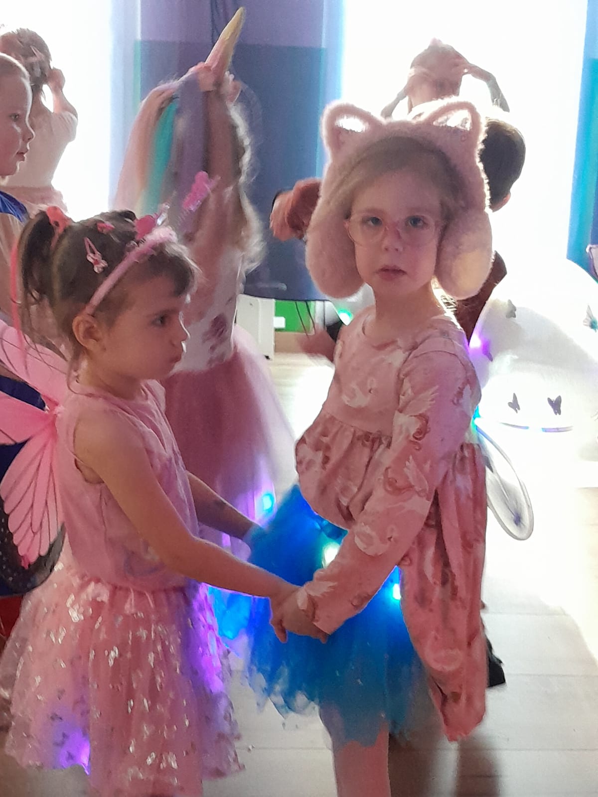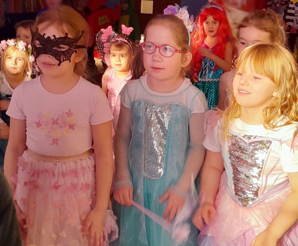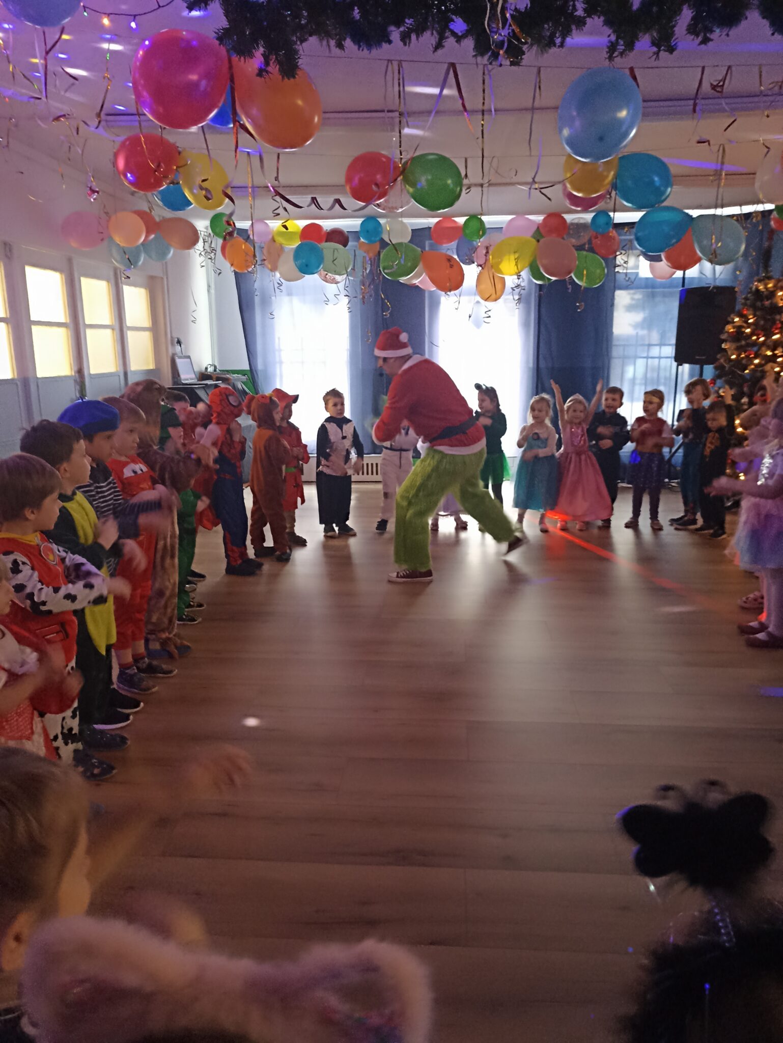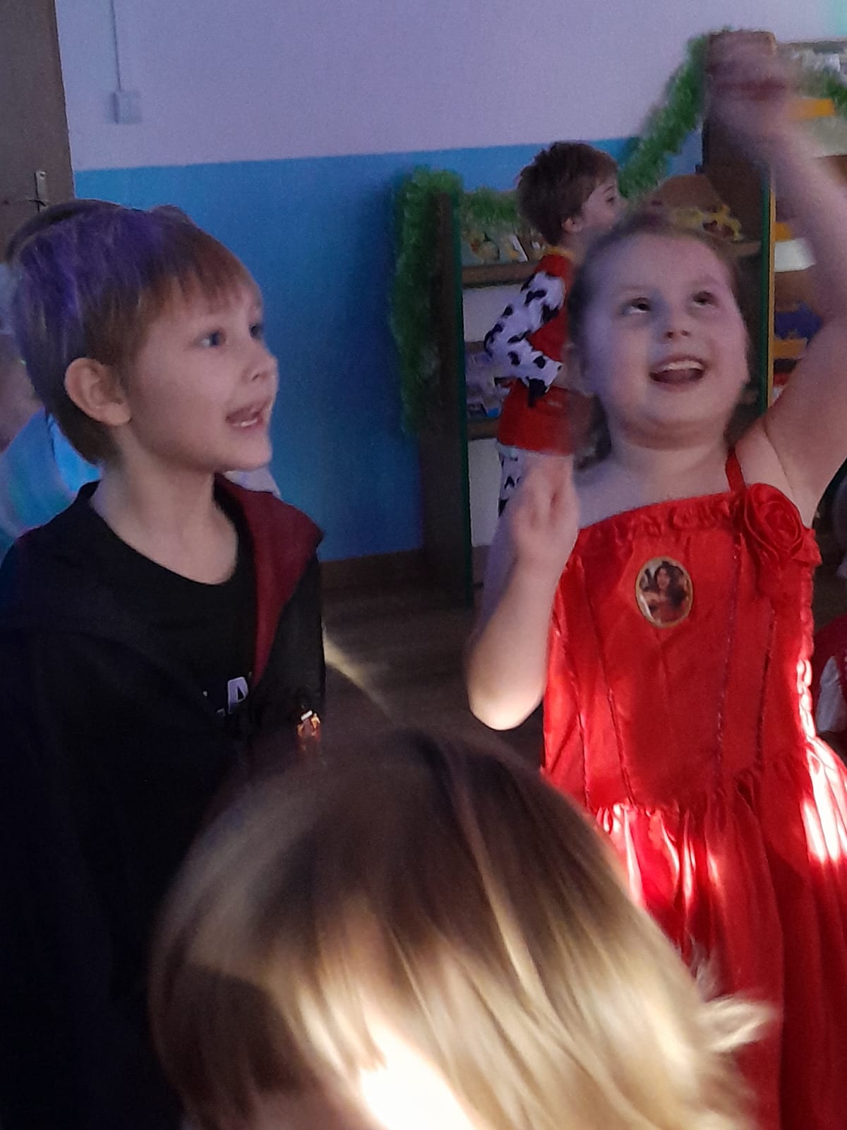 Z wielką radością brały one udział w tańcach i zabawach ruchowych. Nie zabrakło znanych i lubianych utworów, takich jak „Kaczuszki”, „Chocolate”, „Gummy Bear” oraz wesołych tańców-wygibańców. Śmiechu i uśmiechów było co niemiara. Bal był bardzo udany i na długo pozostanie w pamięci najmłodszych. 🎭🎶🫧